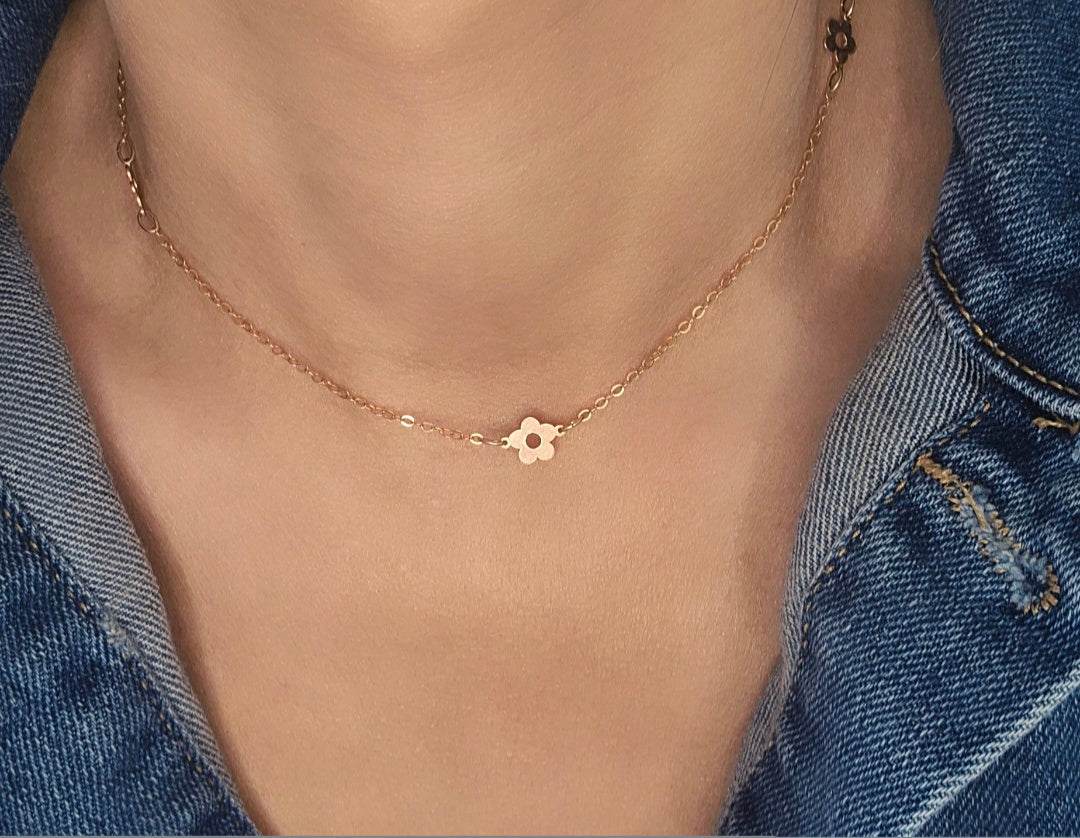 A delicate celebration of simplicity and joy. Featuring a graceful daisy motif, this piece captures the charm of fresh blooms and effortless elegance. Designed to sit lightly at the collarbone, it adds a soft, feminine touch to any look, whether worn alone for subtle beauty or layered for a more playful style.