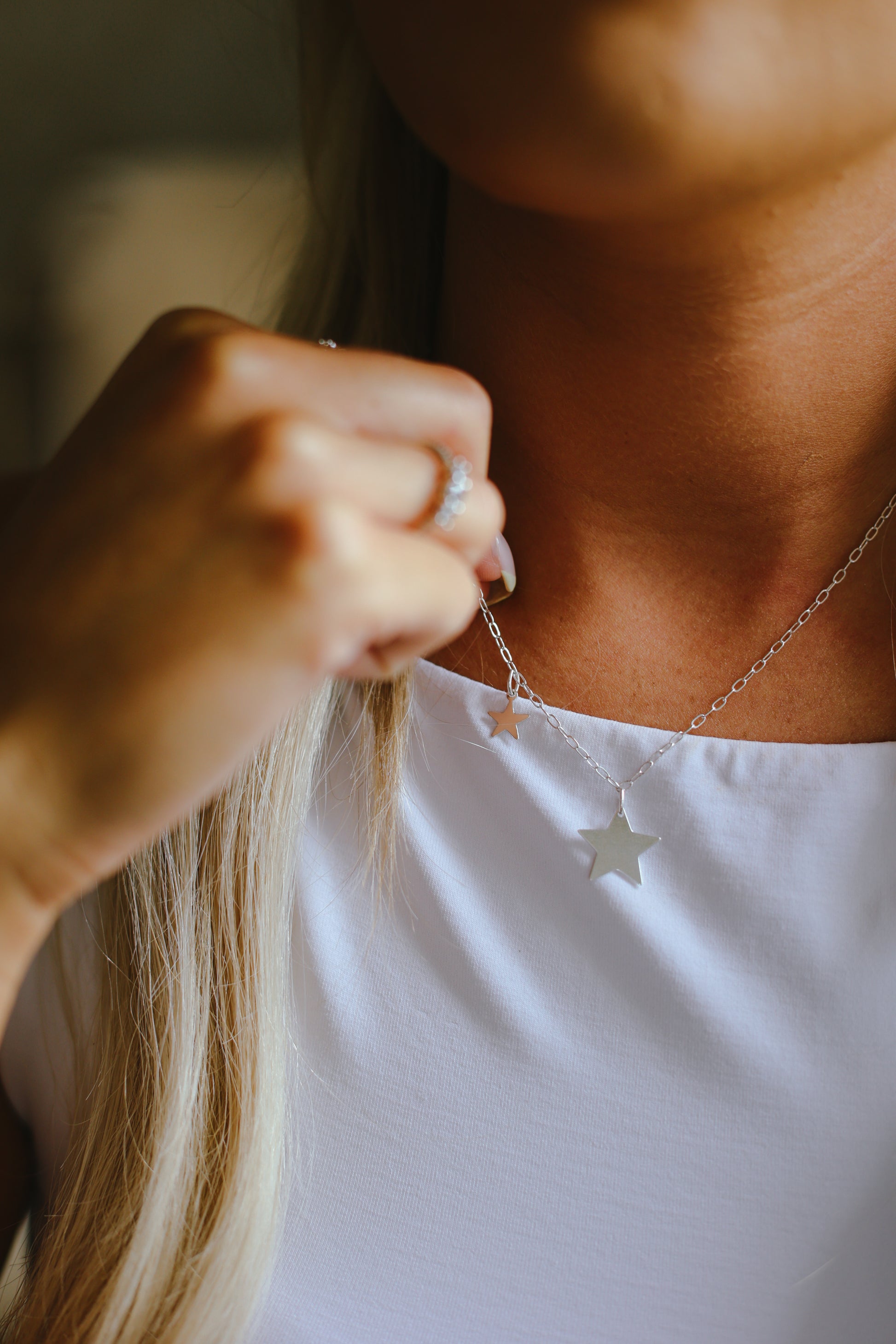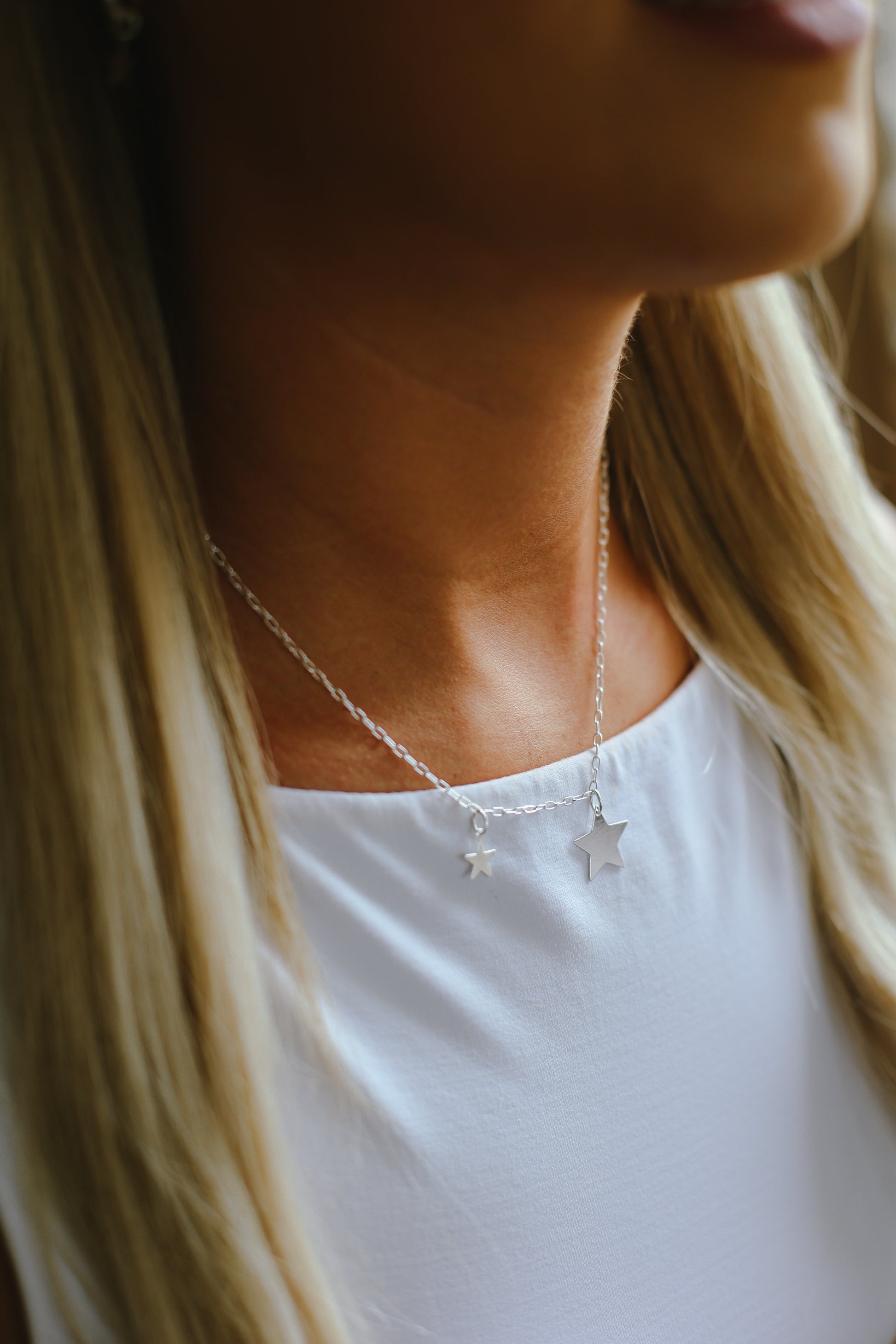 This gorgeous, delicate necklace has one large and one small star, with the small star slightly off centre, making it more elegant and edgy ✨️
